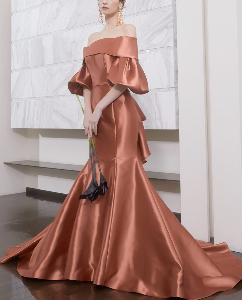 ブリリアンターユ 、品番BRI0064、カラー/テラコッタ、取り扱いサイズ/7号〜11号、カテゴリー/マーメイドライン、デザイン/オフショルダー、ベアトップビスチェ、マテリアル/その他 、イメージ/モード フェミニン シンプル。