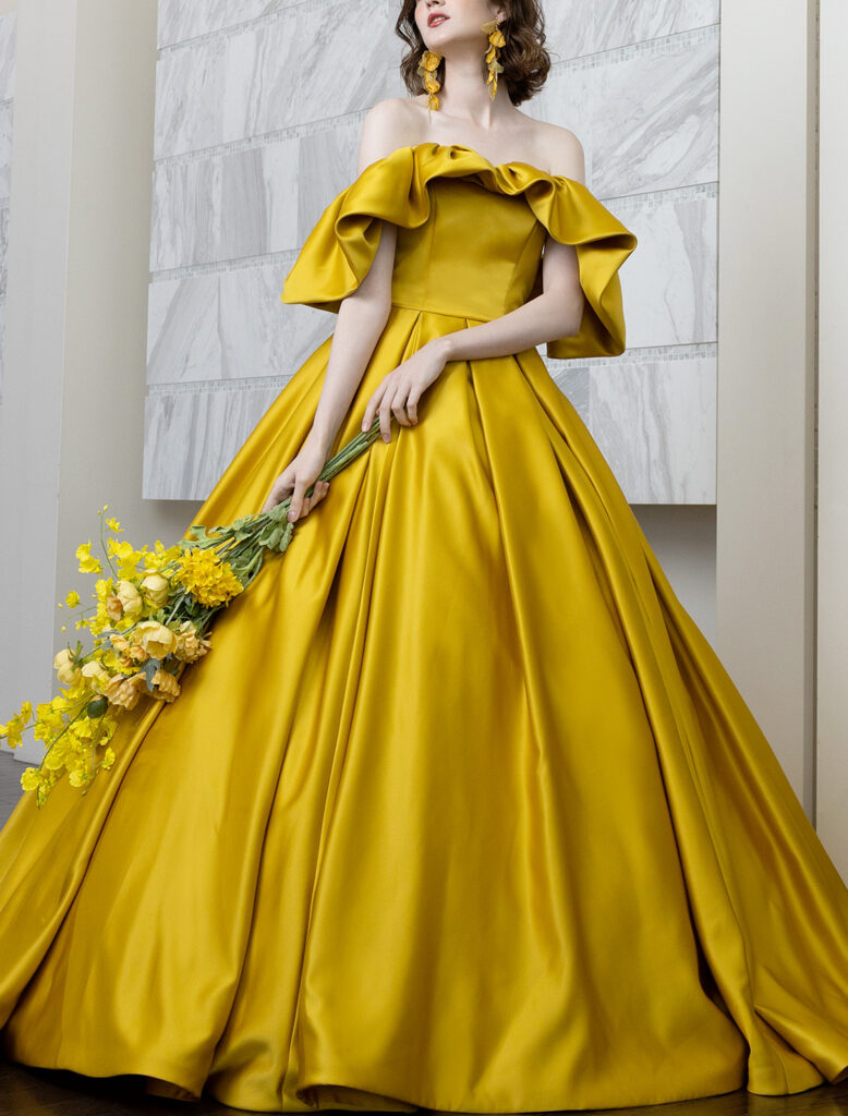 ブリリアンターユ 、品番BRI0071、カラー/マスタード、取り扱いサイズ/5号〜15号、カテゴリー/プリンセスライン、デザイン/オフショルダー、ベアトップビスチェ、マテリアル/サテン 、イメージ/カジュアル フェミニン シンプル。