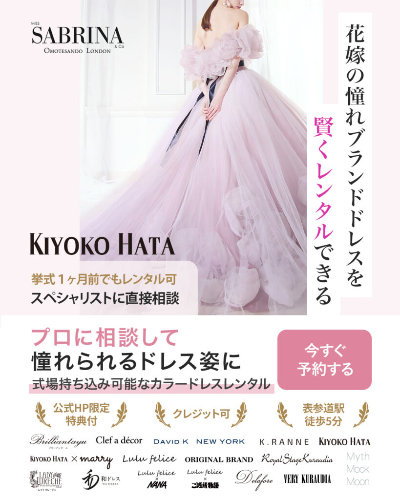 そんな花嫁様にぜひご利用いただきたいのが、MISS SABRINA&CO(ミスサブリナ表参道)です。当ドレスサロンでは、幅広いサイズ展開のあるキヨコハタのレンタルドレスがレンタルできます。特に大きいサイズのカラードレスも充実しています。洗練されたデザインと素材にこだわったキヨコハタのカラードレスは、特別な日を華やかに彩る一着として、多くの花嫁様にご支持いただいています。
