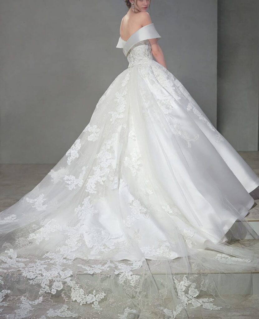 贅沢にちらしたレースとグリッターのロングトレーンは、歩く度にドラマティックな動きを生む要素です。このバックスタイルは、バージンロードに映えることはもちろんのこと、結婚式の際に振り返った瞬間に特別な印象を与えることでしょう。ウェディングドレスのロングトレーンの美しさは、写真映えも抜群です。ゲストの視線を集める上品な仕上がりとなっています。
