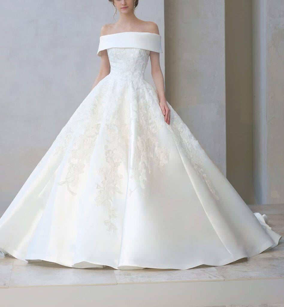 VICTORIA FRANCEZKAのウェディングドレス【HLD-00067-01】は、光沢とハリのあるミカド素材を使用しており、その高級感は一目で伝わります。クラシカルなコードレースとグリッターが組み合わさることで、華やかさが際立つビッグプリンセスウェディングドレスに仕上げられています。特別な日の装いとして、花嫁を一層引き立てます。