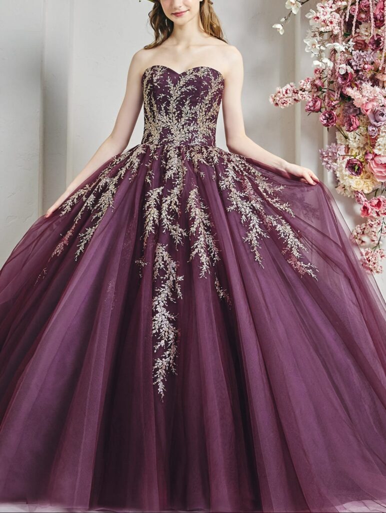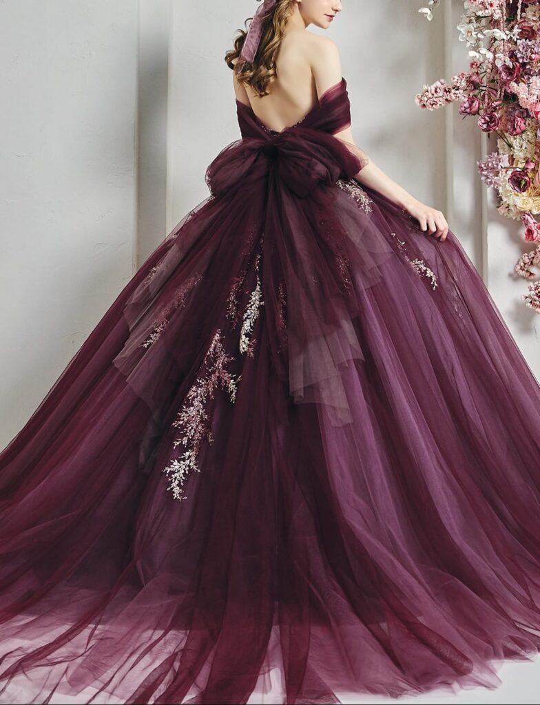 このワインカラードレスの最大の特徴は、深みのあるワインカラーです。この色合いは、洗練された雰囲気を醸し出し、どんなウエディングシーンでも華やかさを引き立てます。ワインカラーのチュールが重なり合うことで、奥行きとリッチ感を持たせる一方で、遊び心ある色使いが特徴となっています。このようなデザインは、他のカラードレスとは一線を画しており、着る人の個性を際立たせます。