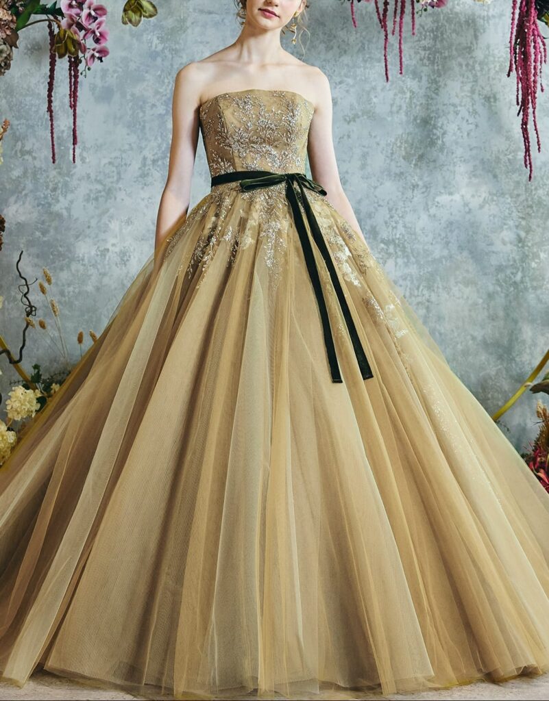 華やかなグリッターと繊細なレースのアップリケが印象的な、「ルルフェリーチェオリーブ【LU-0151】」は、特別な日を彩るカラードレスとして多くの花嫁様に支持されています。このカラードレスレンタルは、5号から15号までのサイズ展開で、さまざまな体型の花嫁様にフィットするデザインが魅力です。