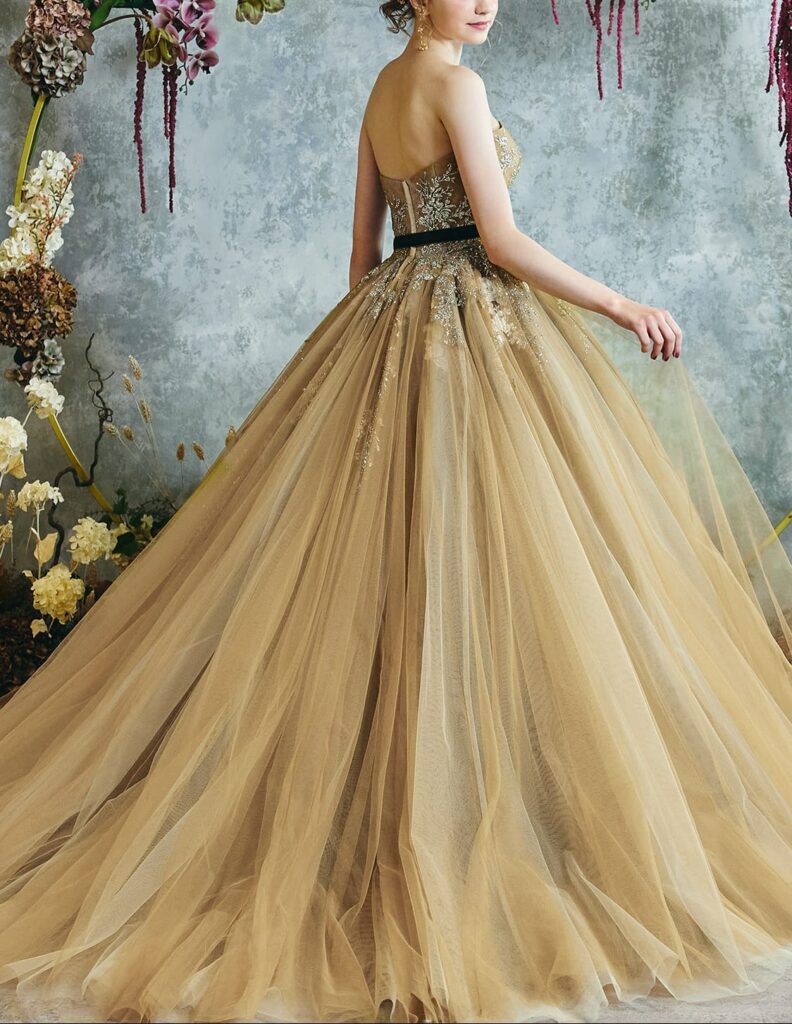 ルルフェリーチェオリーブの最大の特徴は、その目を引く華やかさです。全体に施されたグリッターは、光を受けて瞬く美しさを持ち、カメラの前でもバッチリ映えるポイントです。また、レースのアップリケは、上品さと華やかさを兼ね備え、特別な日の装いにふさわしいデザインとなっています。ルフェリーチェオリーブ【LU-0151】カラードレスレンタルを着ることで、誰もが振り返るような存在感を放つことができるでしょう。